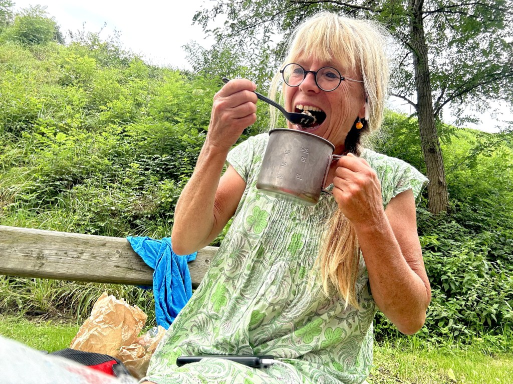 Då tänker jag på vad Lotte säger, visa inte att du ör rädd, titta bara rakt fram och fortsätt cykla…lugnt o syilla. Så jag cyklar vidare så lugnt jag kan och vänder mig inte om för att se om besten lyckats slänga sig genom stålgallret och vips har jag överlevt ännu en hund 😂😂