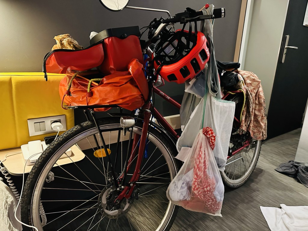 Men idag träffade jag en cyklist som ska vara ute halvår kanske o avsluta i Marocko – hon hittade på en annan inställning på Cykel-Appen för att få bort trapporna – får se om det blir bättre. Hon skickade hem sitt tält och körde elcykel för att komma högre o snabbare upp i bergen. Det är väldigt mycket backar här överallt.