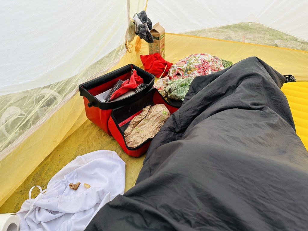Samtidigt torkade jag tältet som är alldeles blött av morgondagg.