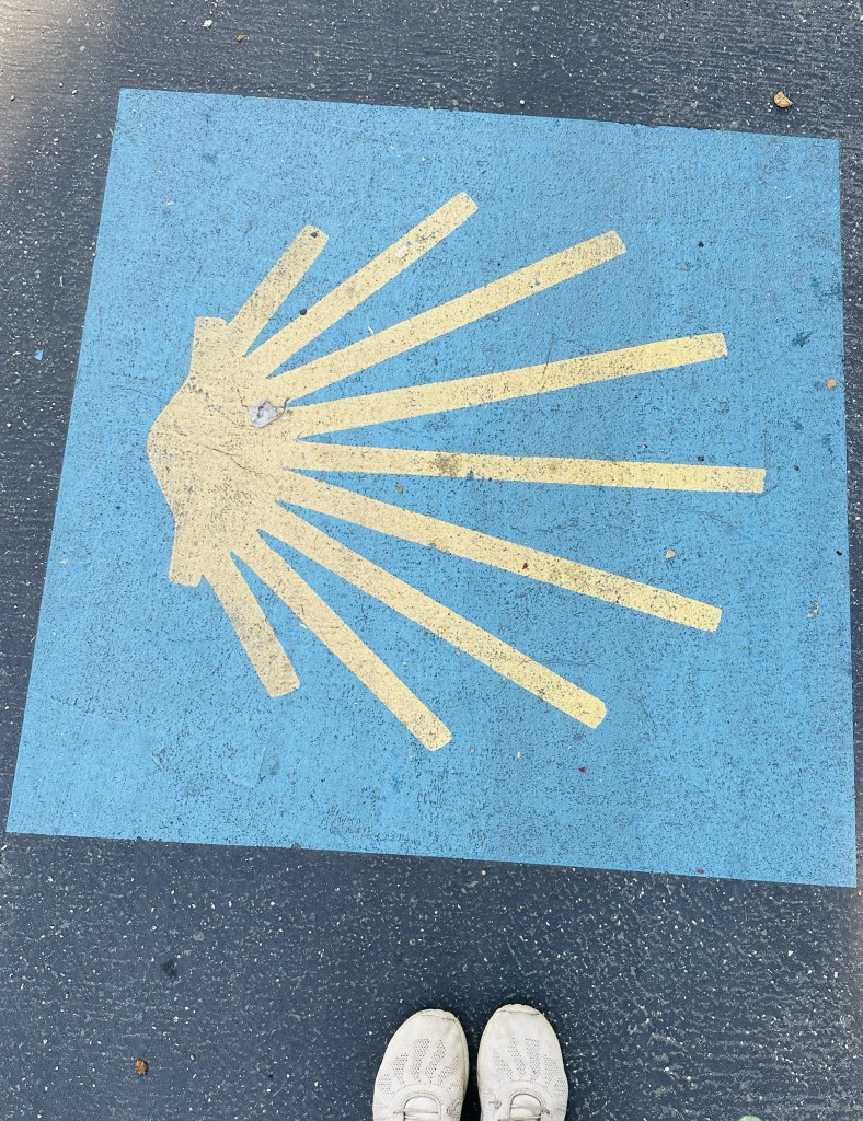 Det här är symbolen för Camino Santiago leden – den är målad på vägen överallt genom cykelvägarna i Pamplona.